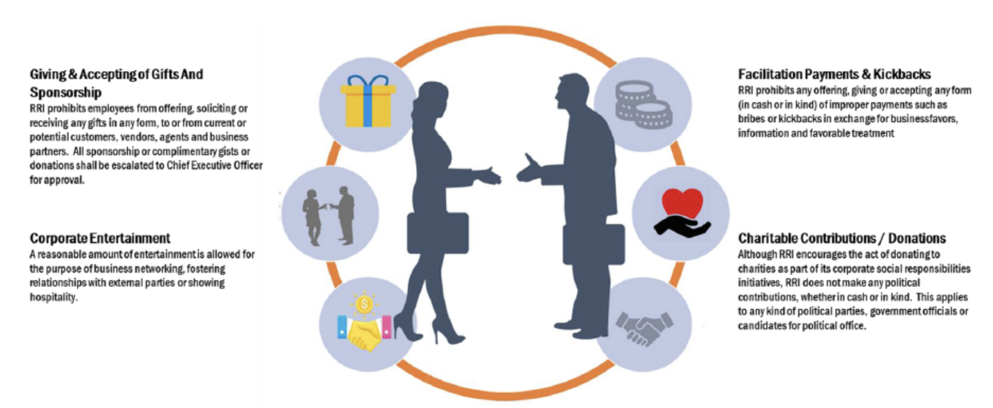 ReGen 反贿赂和腐败政策设定了解决和管理其所有交易中的贿赂和腐败风险以及业务过程中可能出现的相关问题的指导原则。 它重申了我们的承诺,我们的员工和相关人员将完全遵守2009年马来西亚反腐败委员会(MACC)法案和2018年MACC (修正案) 法案以及可能适用的任何其他当地反贿赂或反腐败法律。 本政策与ReGen的行为准则相辅相成,应一同阅读。